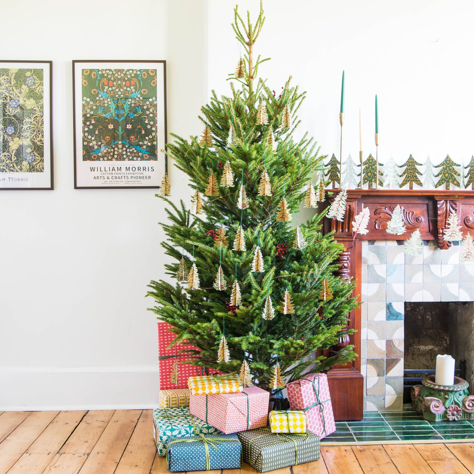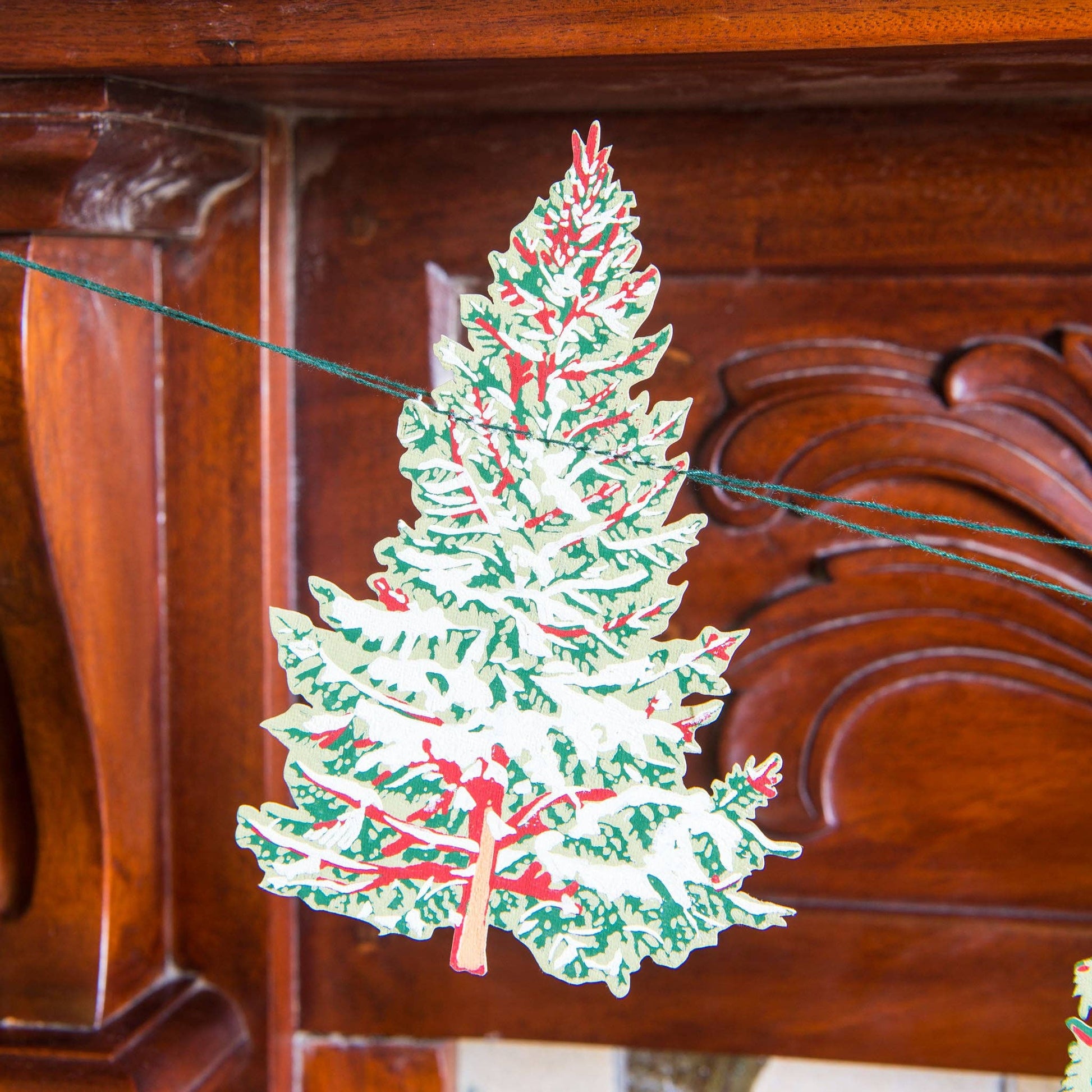 Hand printed three metre long paper garland, featuring ten screen printed paper trees. The garland is printed on both sides on thick, hand made cotton paper. The shapes are sewn in a random order along strong cotton thread, with hanging loops either end, meaning the garland can be hung straight away!