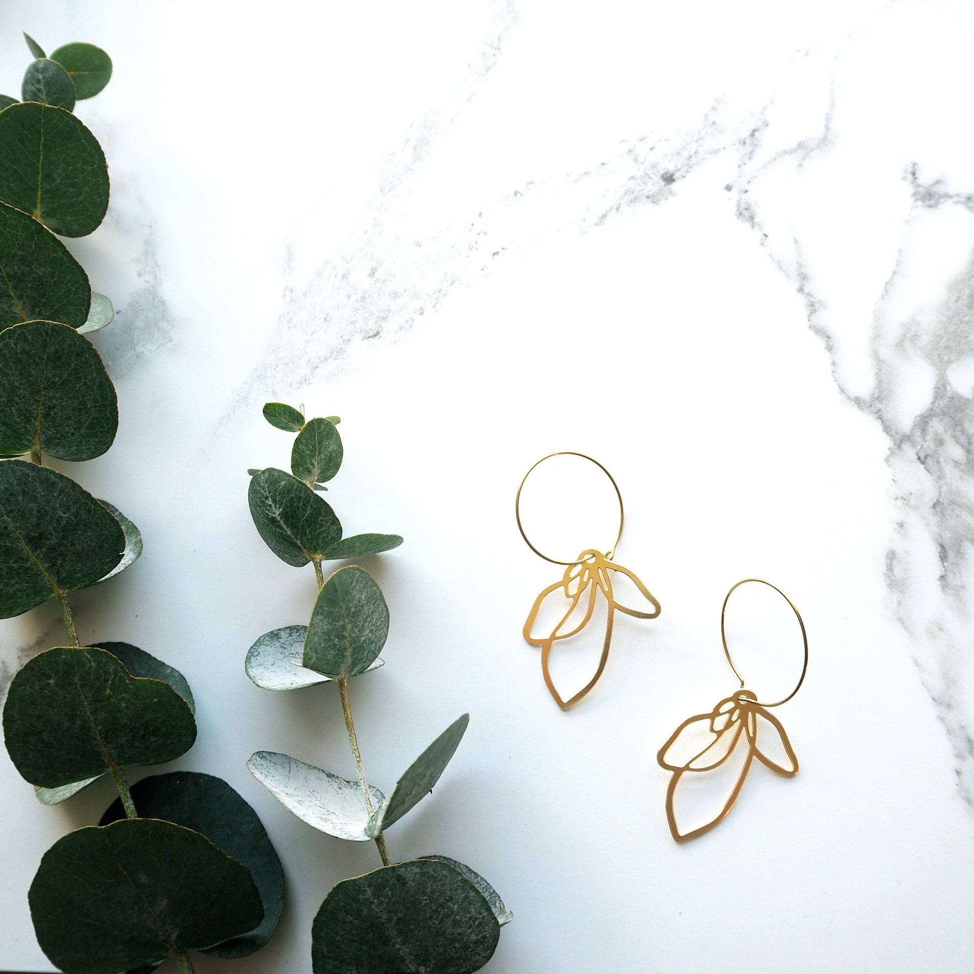 These gold petal hoop earrings are lightweight, measuring 3.5cm, and hang from a 2.5cm gold brass hoop. The flowers are made from laser cut, nickel free brass plated with a lovely matt gold finish. All metal findings are nickel free and hypoallergenic.