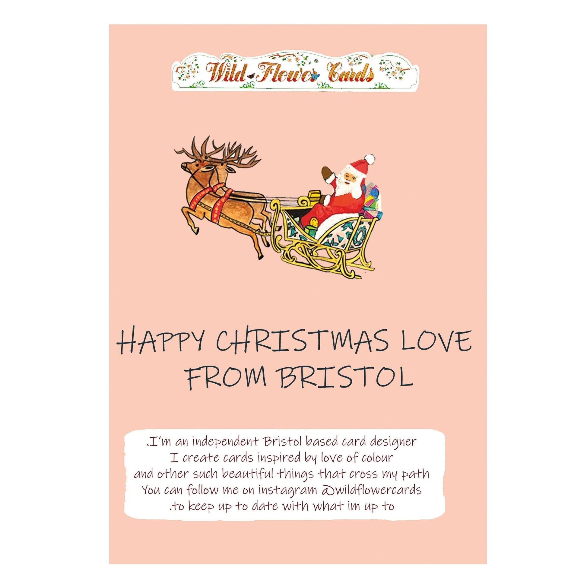 Bright and cheerful Christmas card featuring a view of the Clifton Suspension Bridge at night with Santa flying overhead created by Wildflower Cards, a local artist and designer.