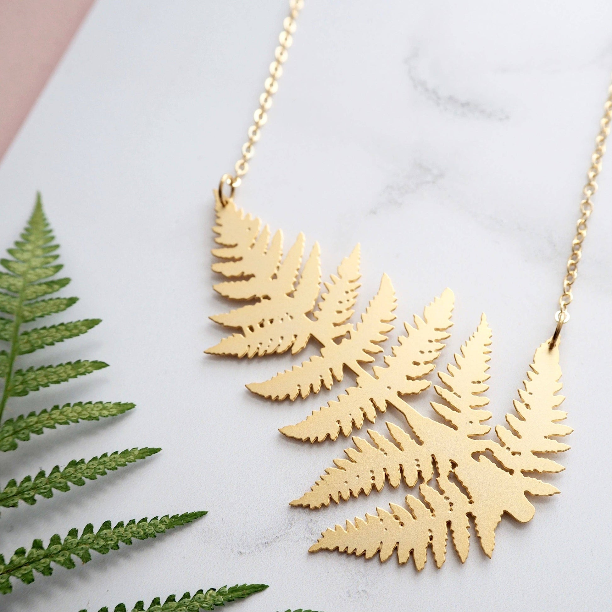 This simple gold fern pendant is lightweight, measuring 7cm, and hangs on a 20 inch gold plated chain, which is nickel free and hypoallergenic. It is made from laser cut nickel free brass and is plated with a lovely matt gold finish.